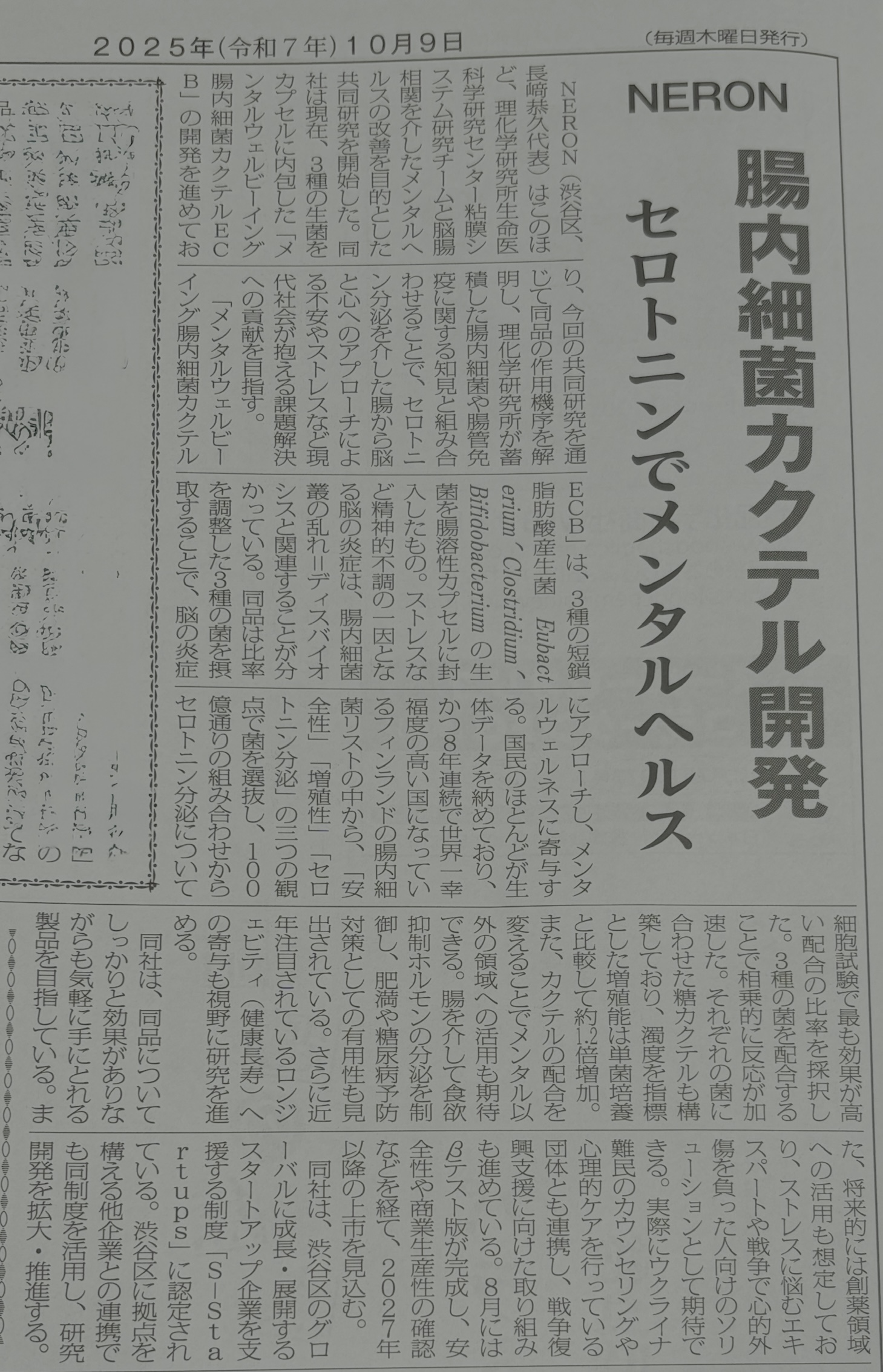 本記事では、株式会社NERONが開発を進める独自の腸内細菌カクテルによる脳内神経炎症の低減に関する取り組みについて紹介されています。